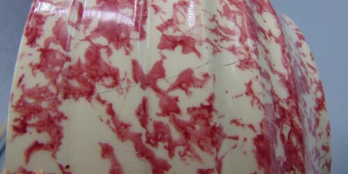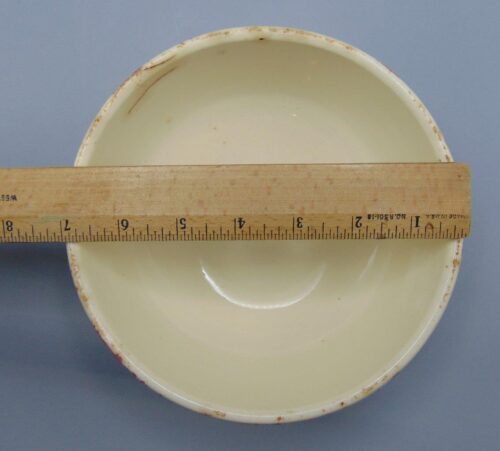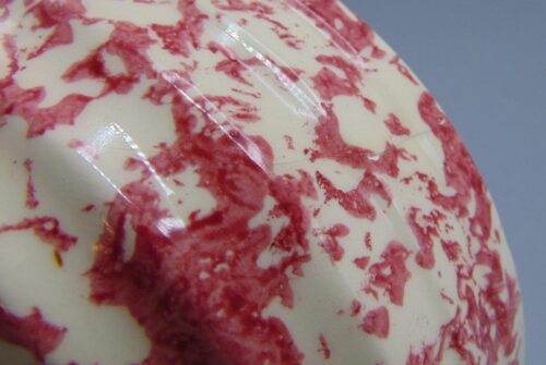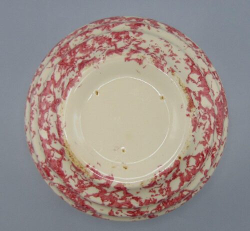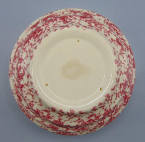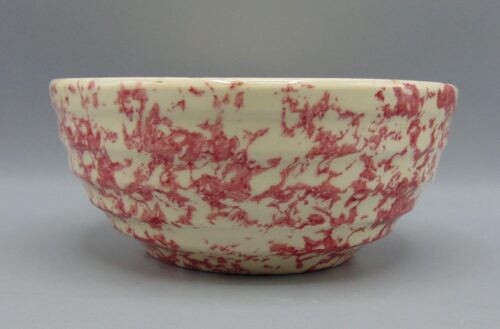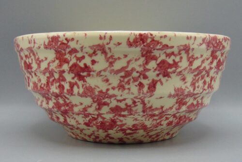 This is a lovely set of primitive mixing bowls with a fantastic sponge red and white colored glaze. They have horizontal ribbing and measure approximately 3″ tall by 7″ wide and 4 1/4″ tall and 9 1/2″ wide.